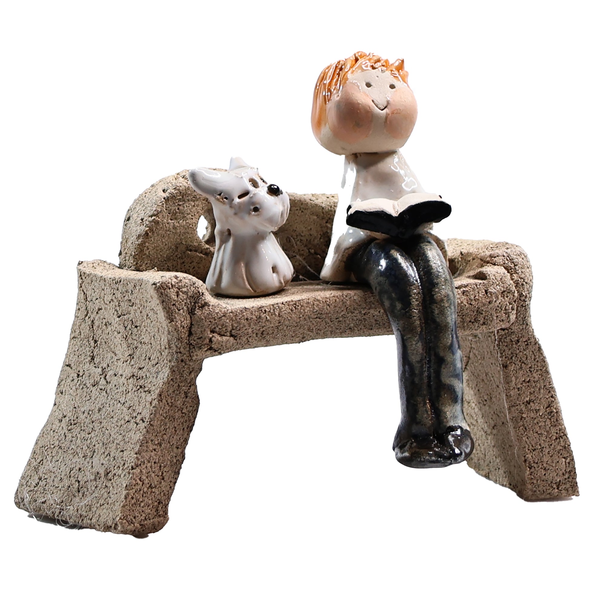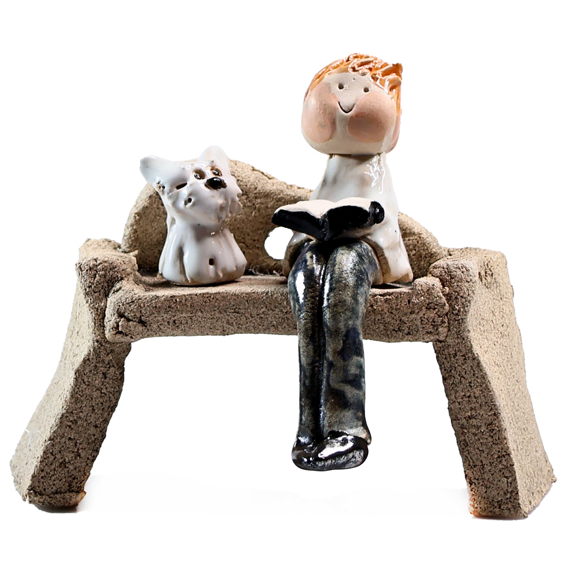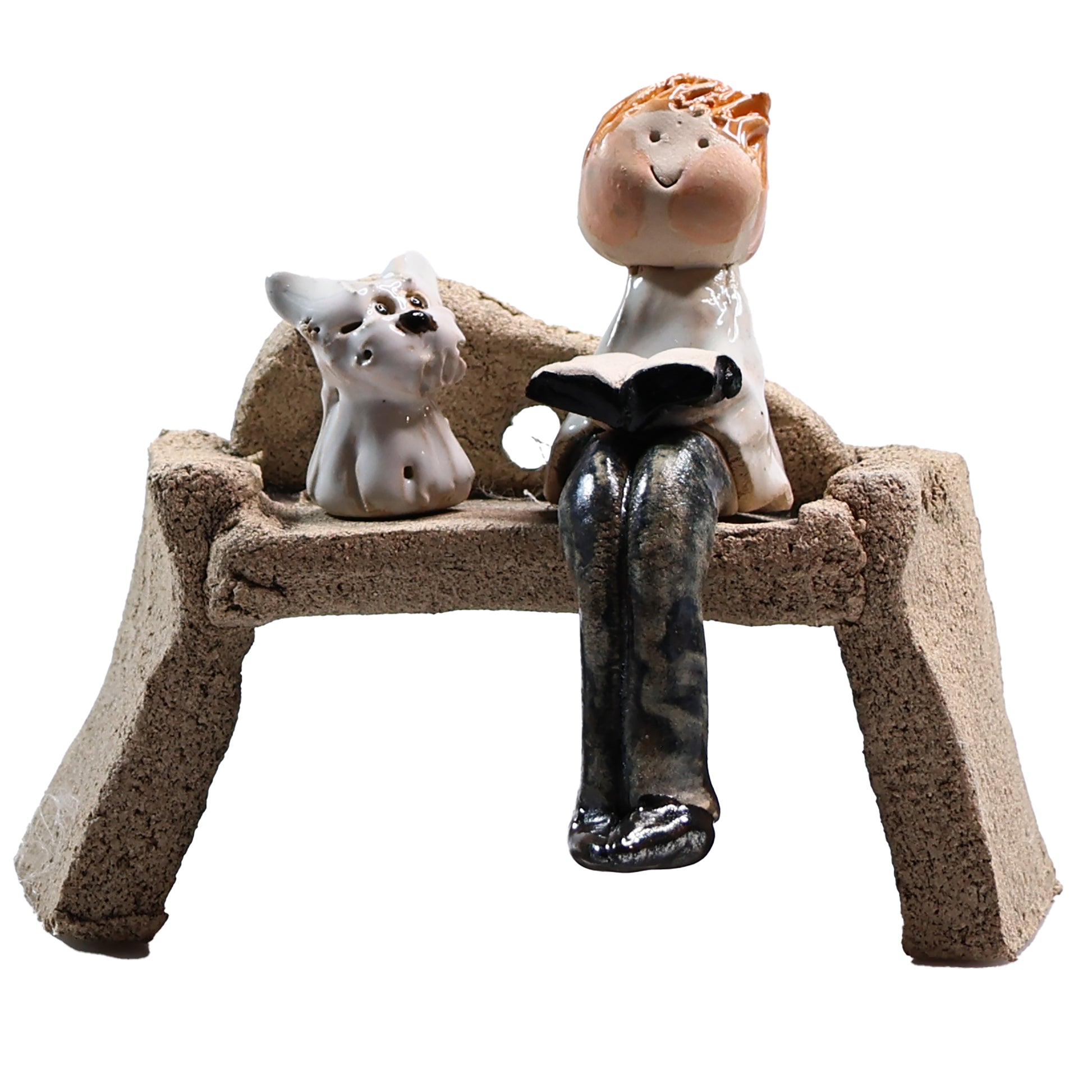Add a heartwarming scene to your decor with this handmade ceramic figurine of a man quietly reading on a bench, accompanied by his loyal white Scottie dog. Dressed in classic white with black trousers, the figure exudes simplicity and charm, while the little Scottie dog sits attentively by his side, adding a delightful touch of companionship. Perfect for book lovers, dog enthusiasts, or anyone who appreciates serene and thoughtful decor, this piece makes a beautiful addition to any room or a meaningful gift. Crafted with care, each piece showcases the artistry of ceramic craftsmanship.