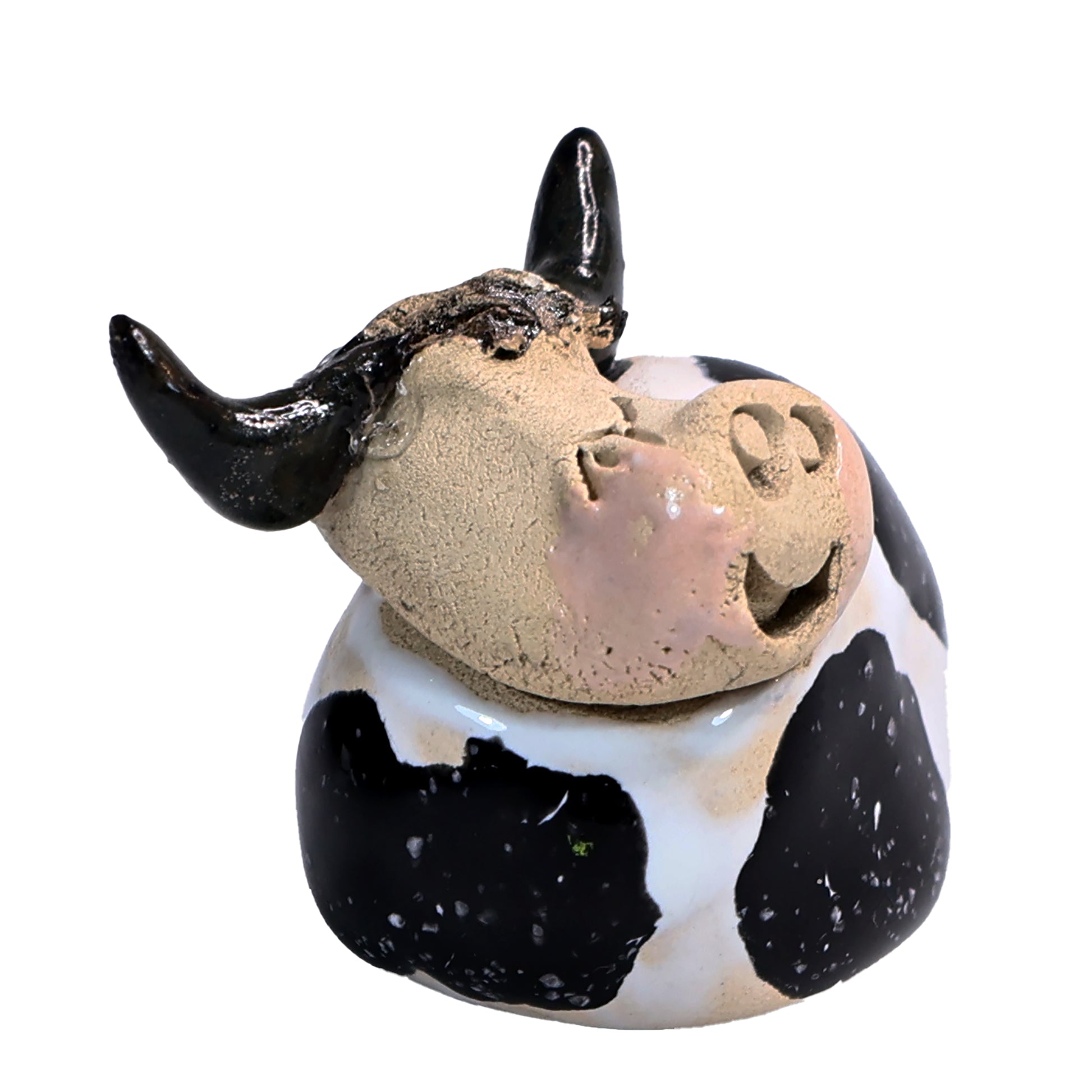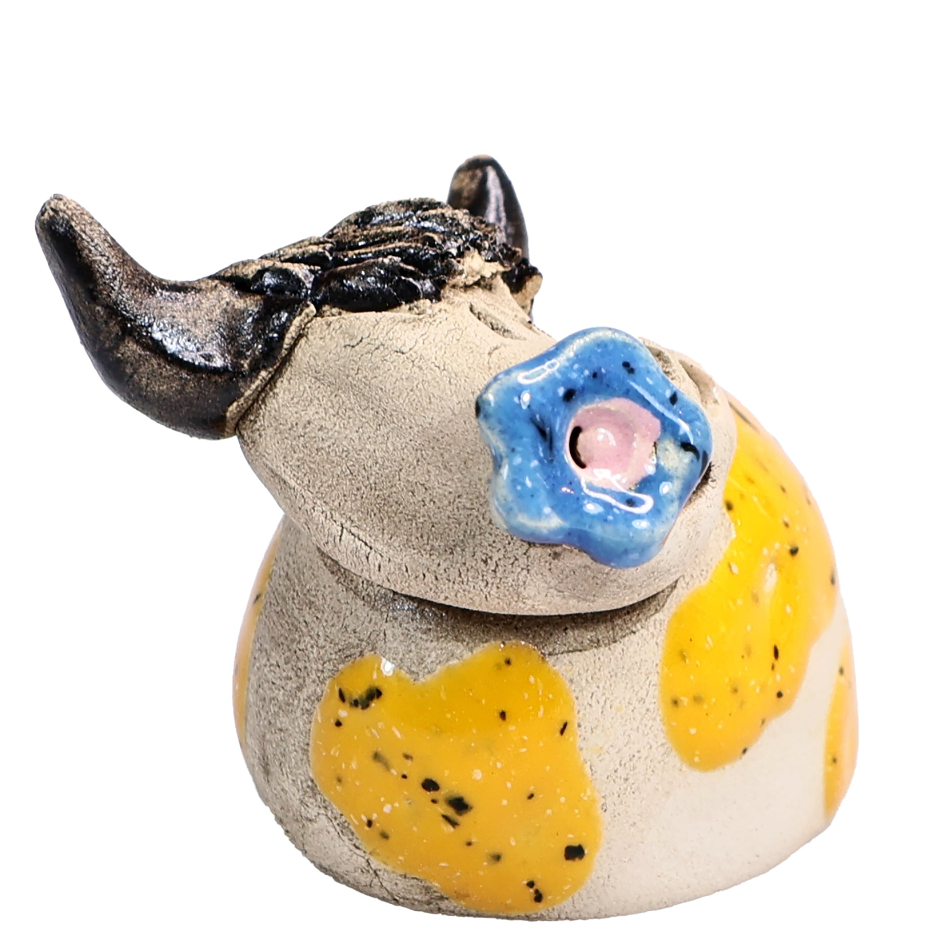 Introducing this charming mini highland cow couple, carefully handmade from ceramic to bring character and warmth to any space. One cow features a unique black-and-white spotty coat, while the other shines in a playful yellow-and-white spotty pattern, holding a delicate flower in its mouth for a touch of whimsy. Both adorned with beautifully crafted ceramic horns, these cows make a delightful gift for animal lovers or a unique addition to your home décor. Ideal for display on shelves, desks, or mantels, this endearing duo adds personality and colour to any room. Crafted with love and care, each piece reflects the artistry and charm of handmade ceramics, ensuring they’re as meaningful as they are decorative.