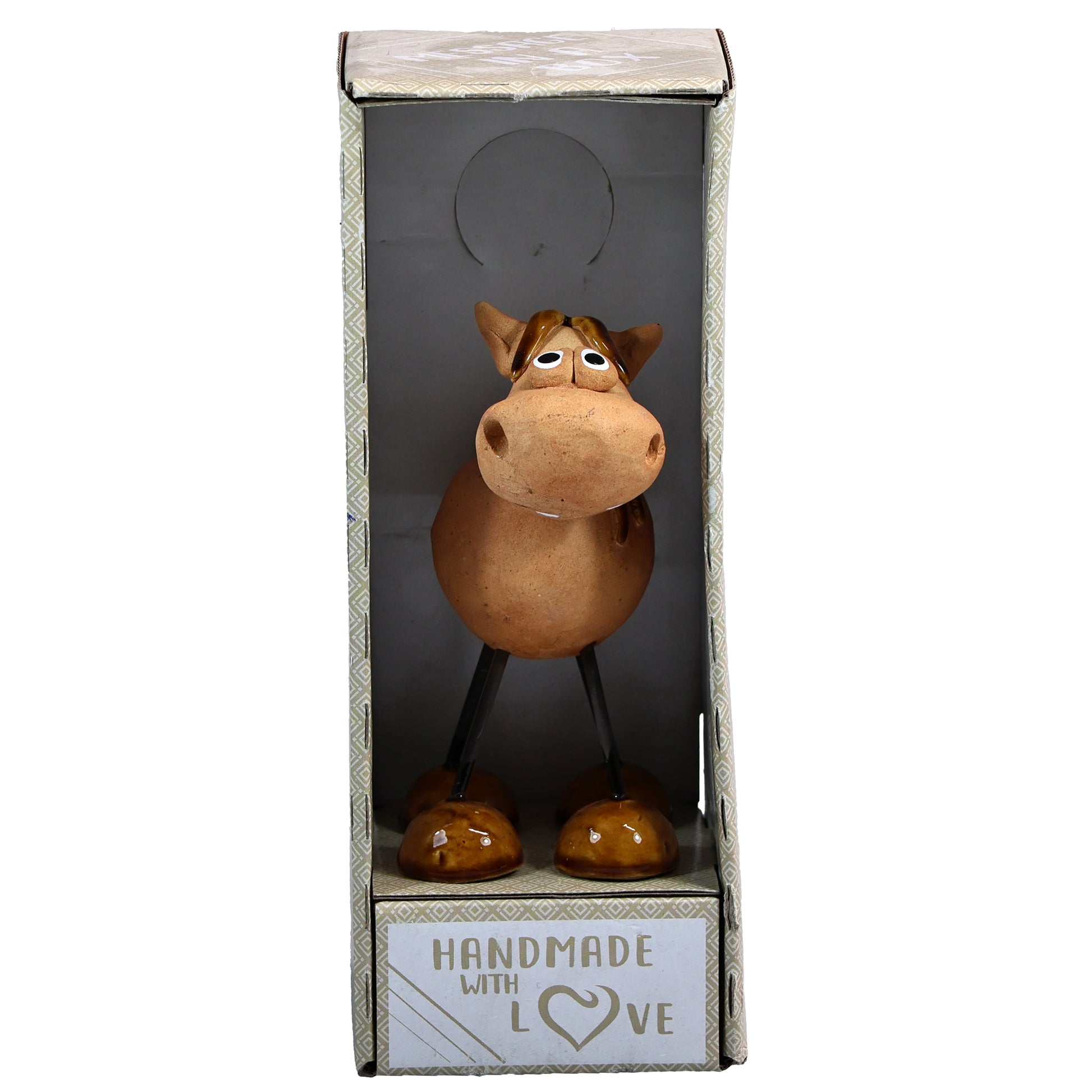 This handmade wire leg horse figurine is a unique and artistic addition to any home. Crafted from high-quality ceramic and featuring elegant wire legs, this charming horse stands out with its playful and rustic design. The rich brown ceramic body adds a touch of warmth and natural beauty, making it an ideal piece for lovers of horses or creative décor. Perfect for displaying on a shelf, mantelpiece, or desk, this wire leg horse brings a whimsical yet graceful touch to any space. Whether as a thoughtful gift or a personal keepsake, this figurine is sure to add character to your home.